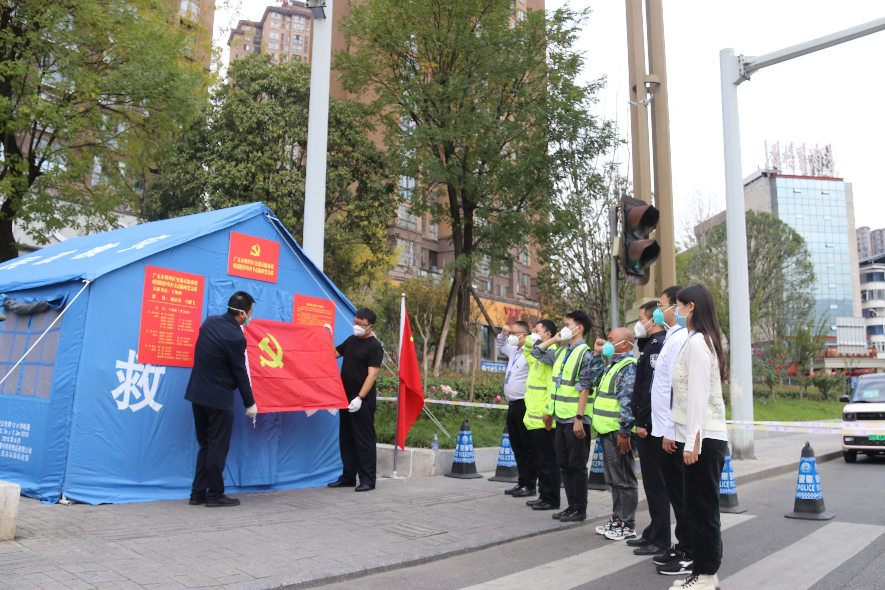 10月23日,面向鲜红的党旗,利州区交通运输系统疫情防控琴台卡点临时党支部书记、点长王加林同志举起右拳,带领卡点党员干部重温入党誓词。