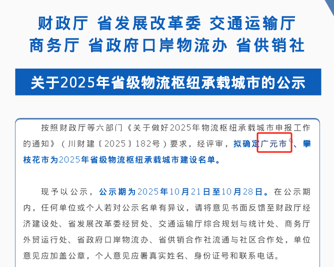 10月21日,经省级评审,拟确定广元市、攀枝花市为2025年省级物流枢纽承载城市建设名单。