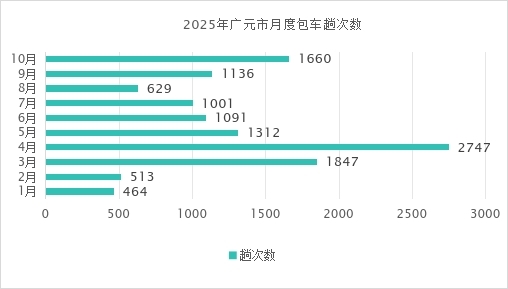 从月度情况来看,分别为1月464趟次、2月513趟次、3月1847趟次、4月2747趟次、5月1312趟次、6月1091趟次、7月1001趟次、8月629趟次、9月1136趟次、10月1660趟次。包车趟次呈现明显的季节性波动,在“两考”“研学”、暑期和节假日包车订单量显著增加,夏季受高温多雨影响而减少,总体受节假日、气候及相应的商务旅游活动周期驱动。