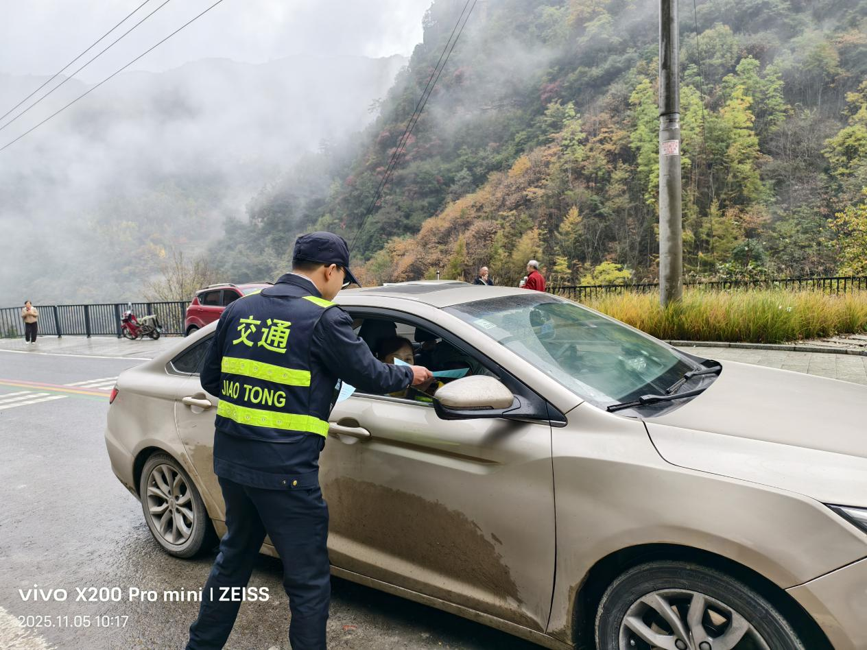 二是暖心服务,传递旅途温度。在严格执法保通保畅的同时,执法人员化身“暖心驿站”志愿者,用细致服务为游客旅途增添温情。按照上级统一安排,大队抽调12名执法人员,分别在蝶心谷、樱花谷、蚂蟥垭等志愿服务点,开展车辆引导、人员疏导以及为游客提供免费热水、应急药品等物资,解决游客途中的紧急需求,确保广大游客在赏红叶的同时,拥有舒心、便捷的旅游体验。